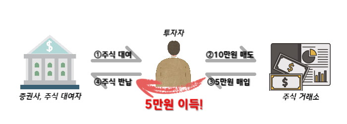 Ex. 현재 주가가 10만원인 ㅁㅁ사의 주식을 대여자를 찾아 빌린 후 매도한다.(10만원에 매도) -> ㅁㅁ사의 주가가 5만원으로 하락하여 다시 매수한다.(5만원 매수) -> 주식 대여자에게 빌렸던 주식을 돌려준다.(5만원의 수익 발생)