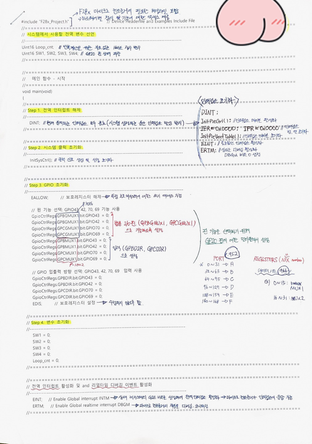 아래 코드는 싱크웍스의 Delfino 개발보드 F28377D 예제 1번의 CCS 코드입니다.
