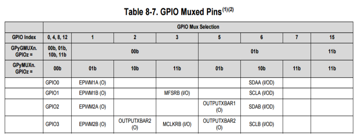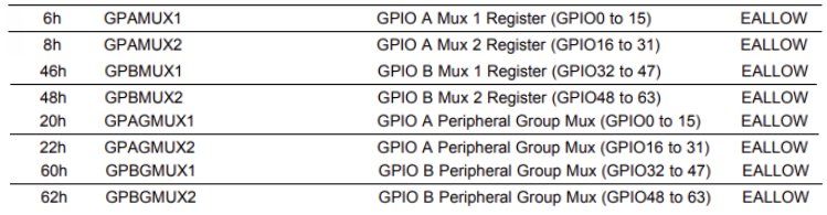 내부 MUX를 통하여 더 많은 주변장치들과 연결되어있습니다. → 한 PIN에 최대 8가지 기능을 수행 가능합니다. MUX Register를 통해 기능 선택 가능.(ex. GPIO, ePWM, MCLKRA, eCAP, ...)