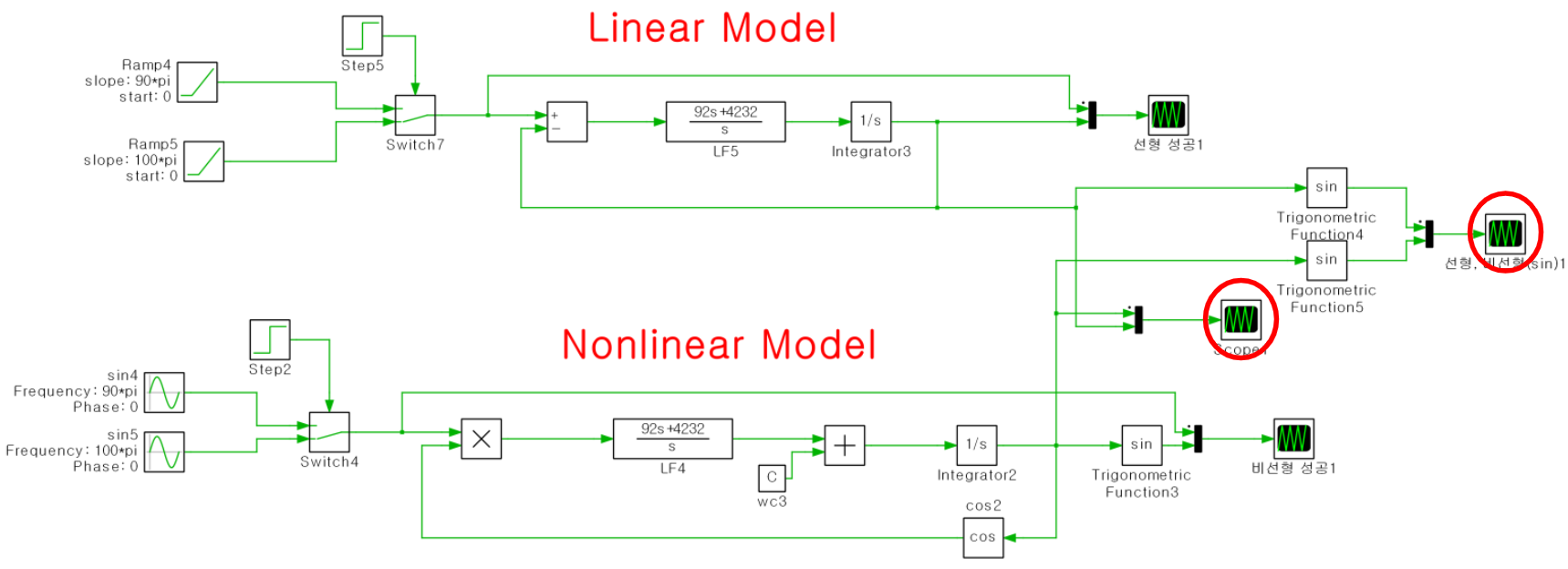 위 사진은 선형 모델과 비선형 모델의 주파수 변화를 Plecs 상에서 구현한 예시입니다.