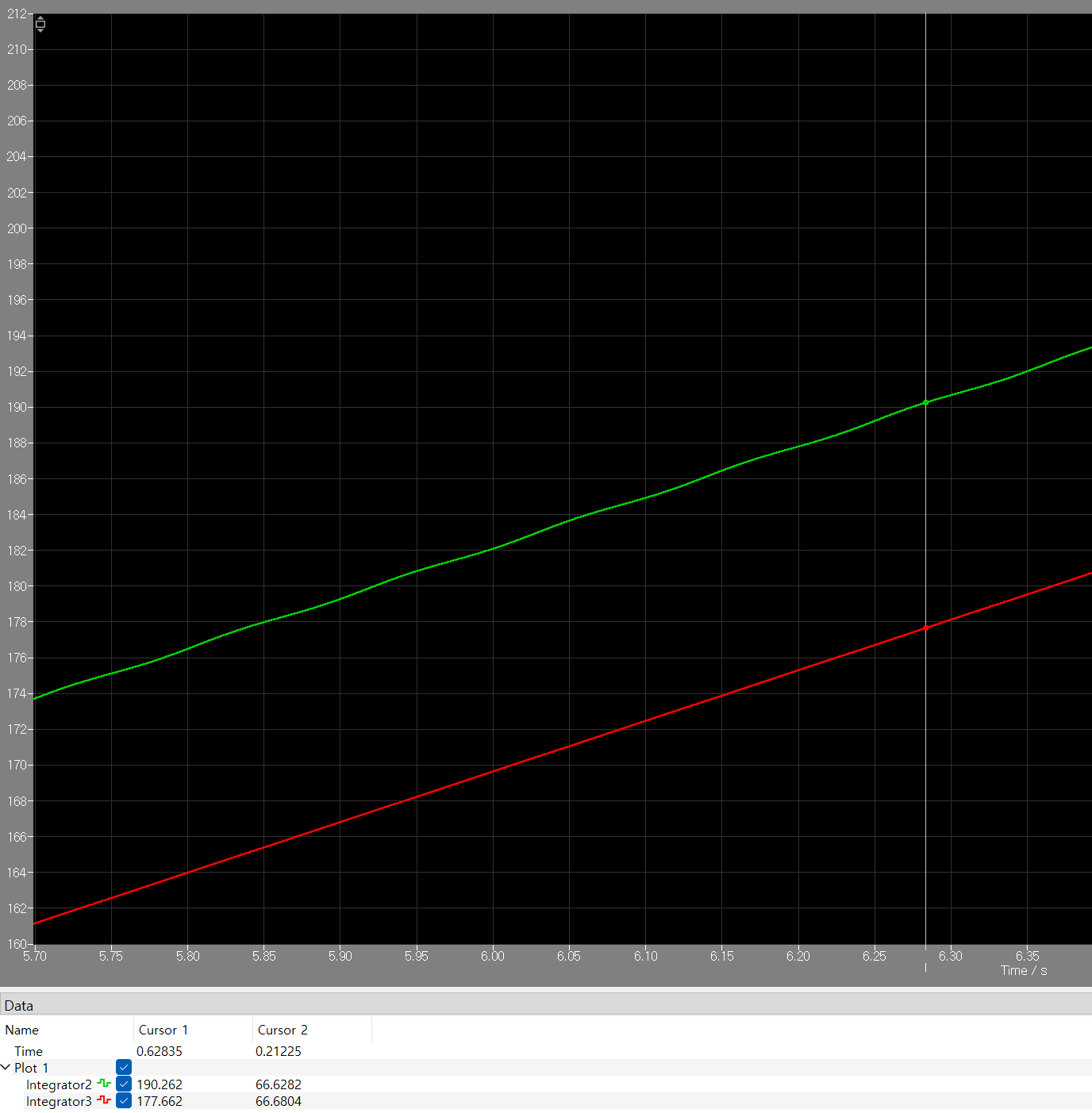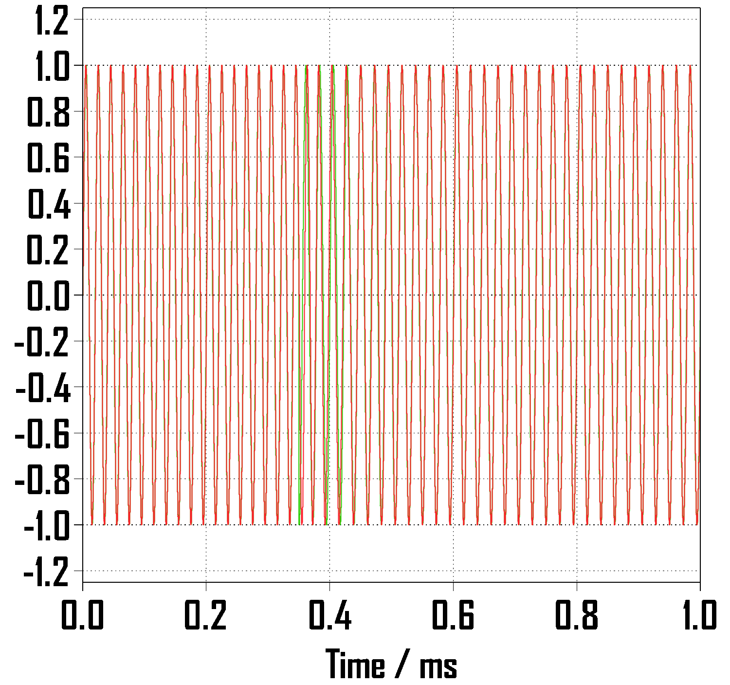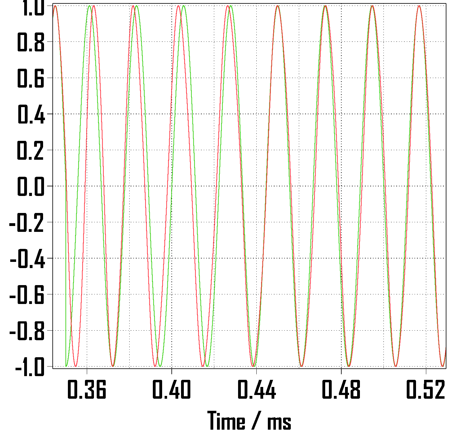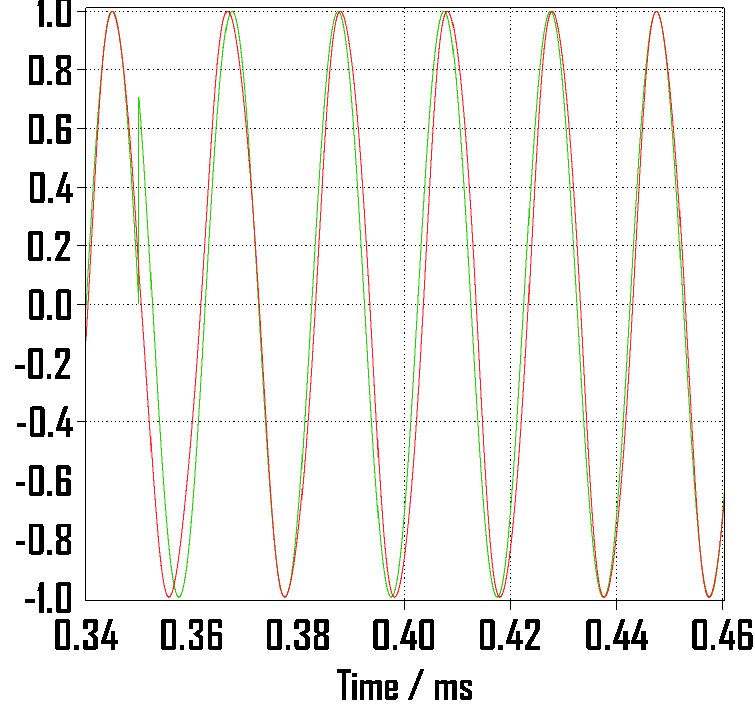 위상각 점프 pi/4에 맞게 시작시간을 1/400초만큼 늦춰주었기 때문에 origin(원점)에서부터 차이가 있고 정착시간인 0.1초 내로 추적함을 알 수 있습니다. 그리고 정상상태에 진입하여 진행하다가 0.35초에 위상각 점프를 하게 되면 두 그래프는 서로 어긋나게 되고 또다시 0.1초 내로 추적하여 거의 붙는 것을 볼 수 있습니다.