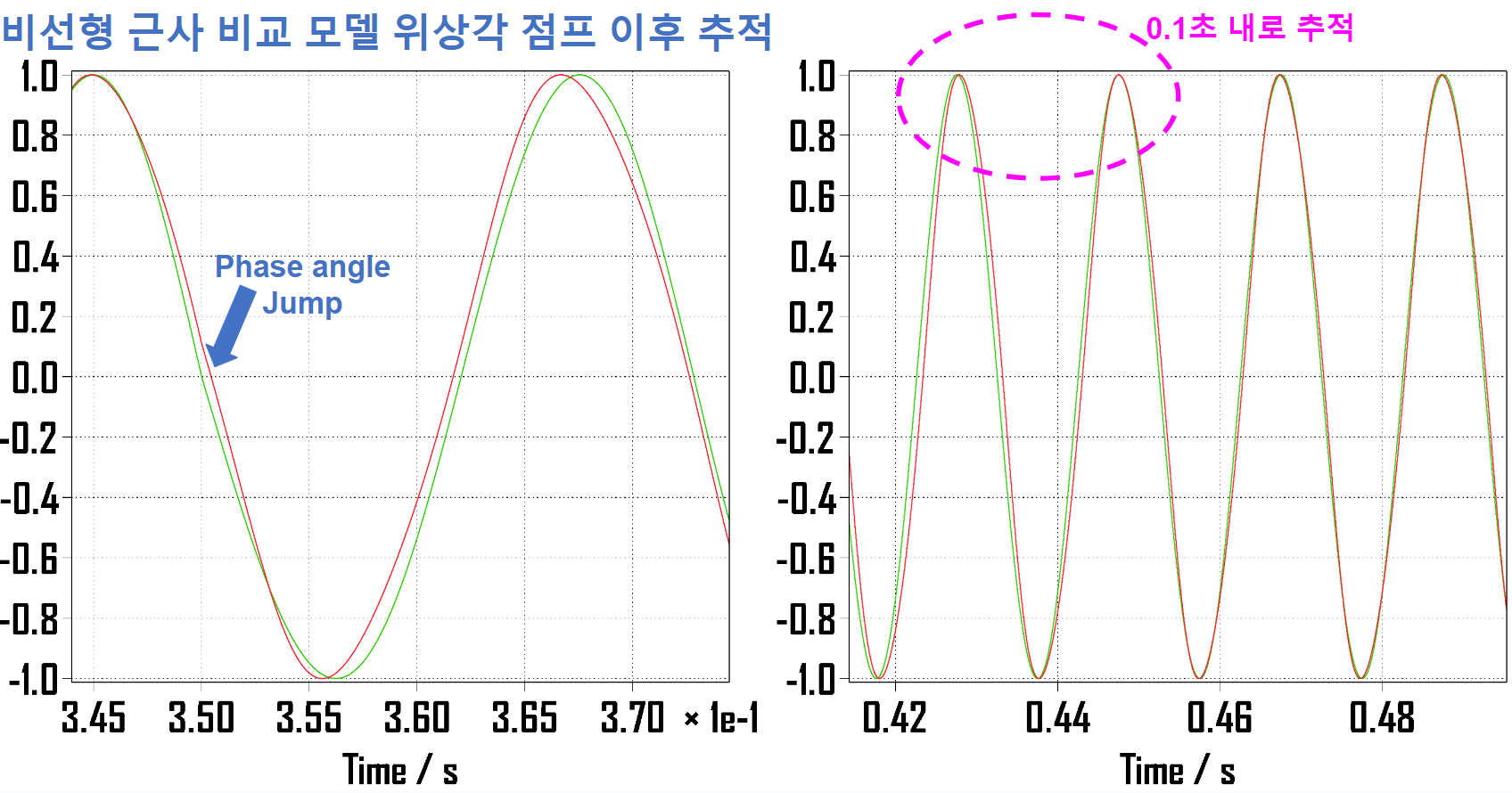 비선형 모델도 선형 모델과 마찬가지로 위상각 점프 이후 정착시간 0.1초 내에 다시 근접함을 볼 수 있습니다.