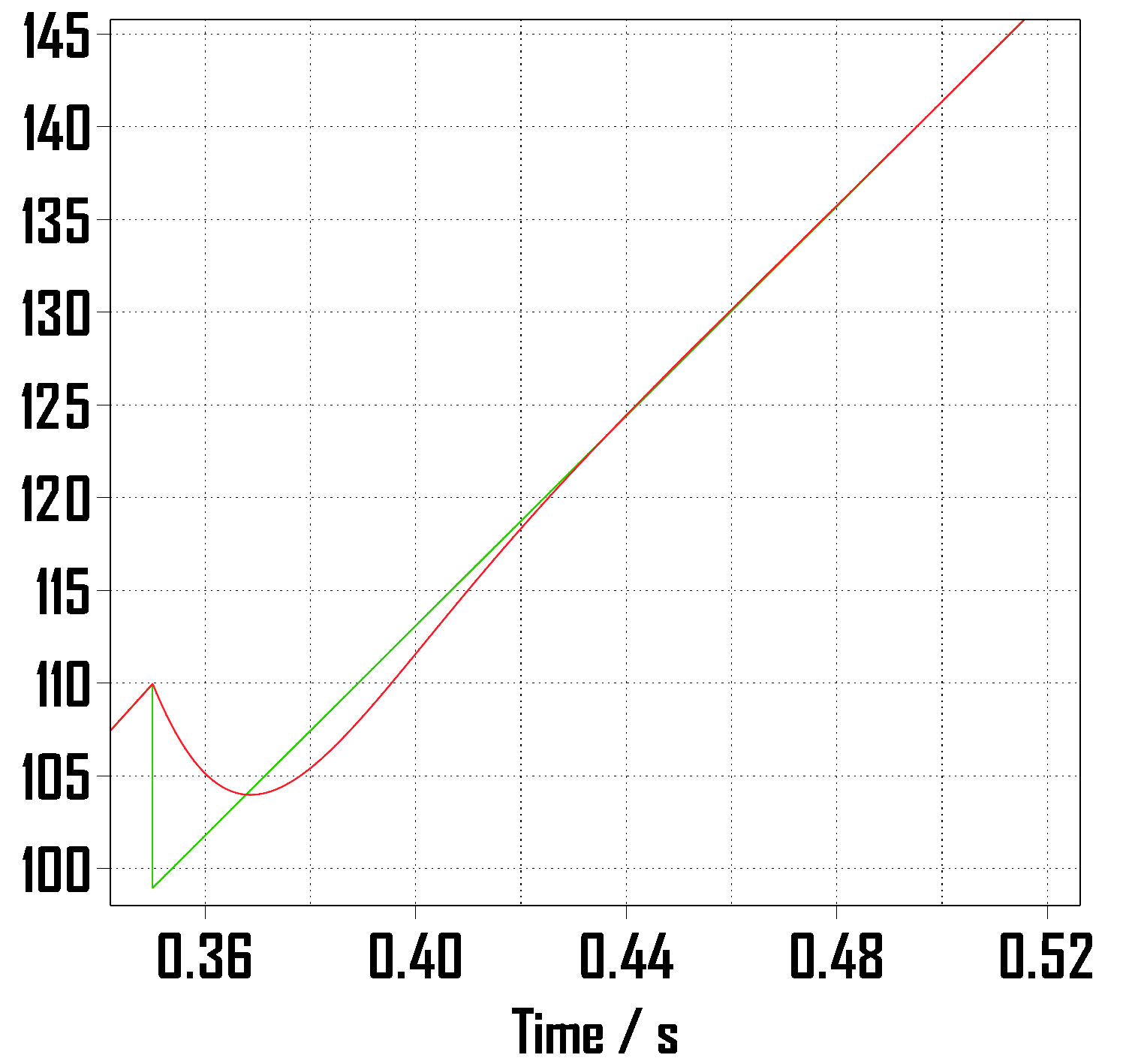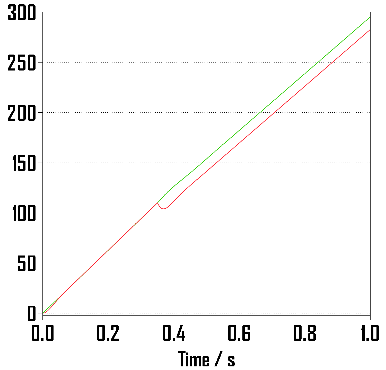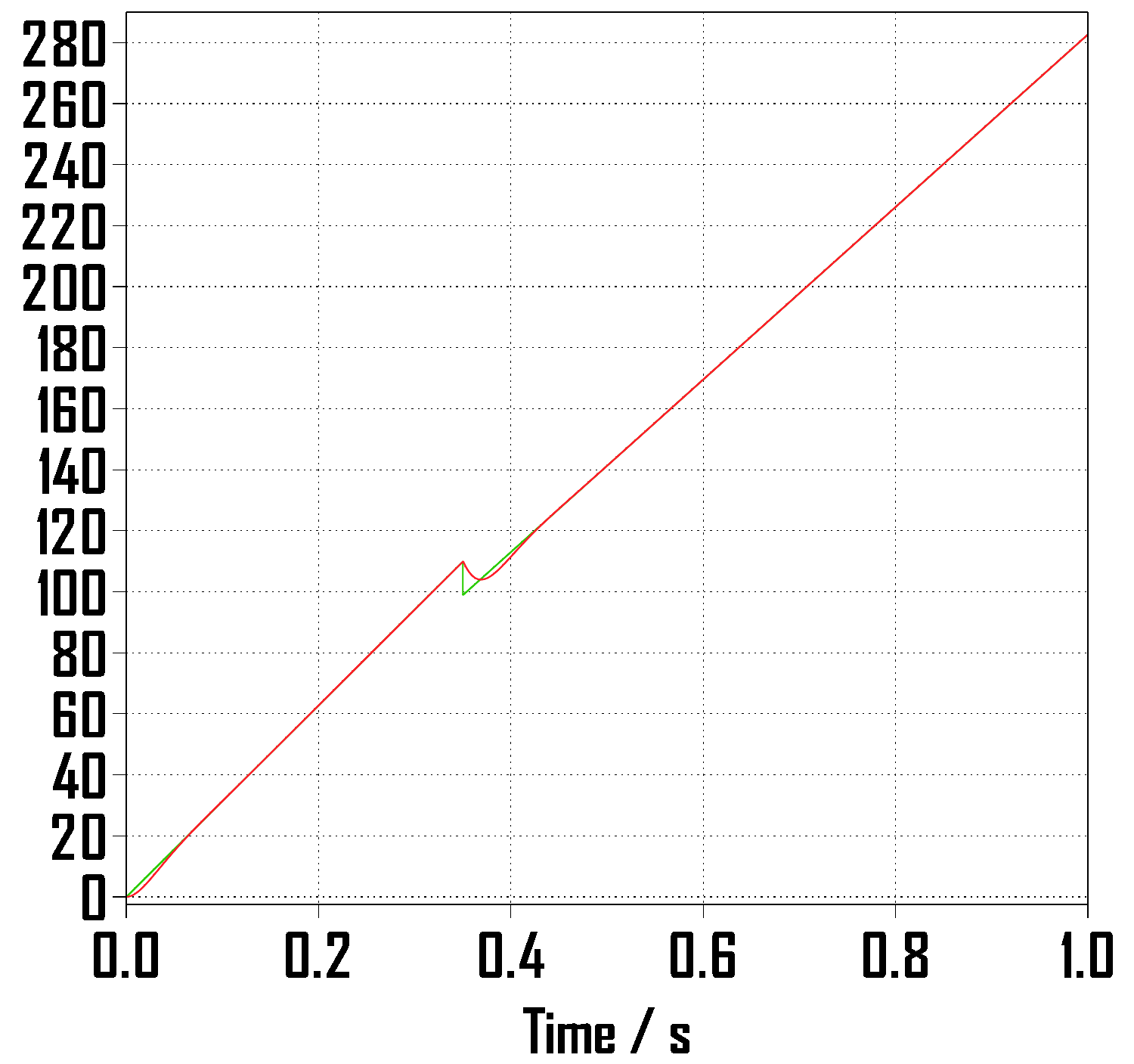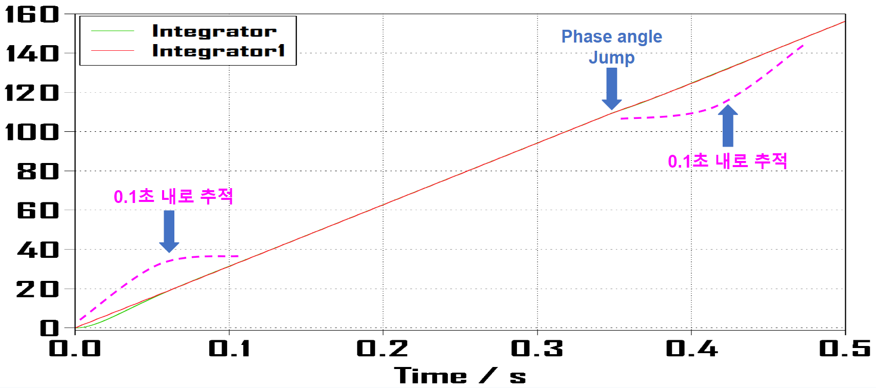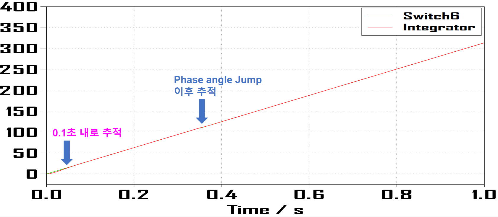 정현파 입력의 step 이후에 위상각 점프를 (- pi/4) 를 주었고 그에 맞게 step 이후의 램프 함수는 1/400초만큼 시작 시간을 늦추어주었습니다.