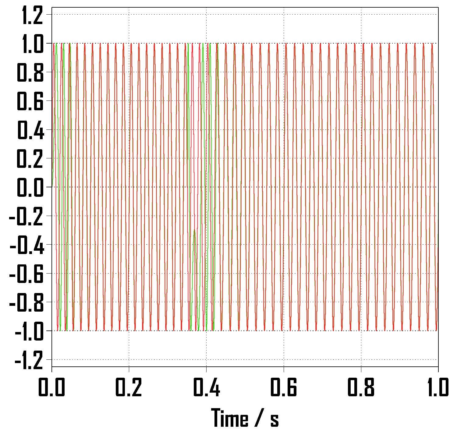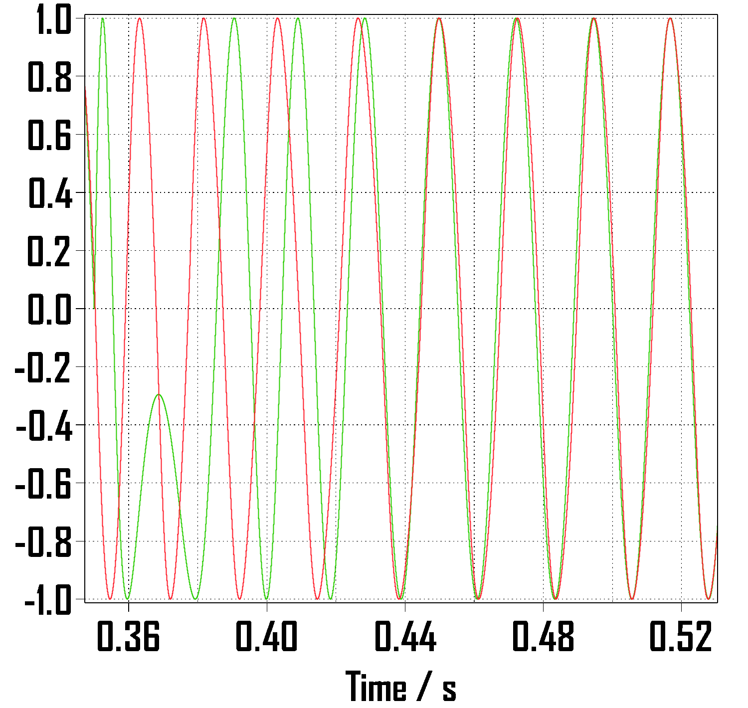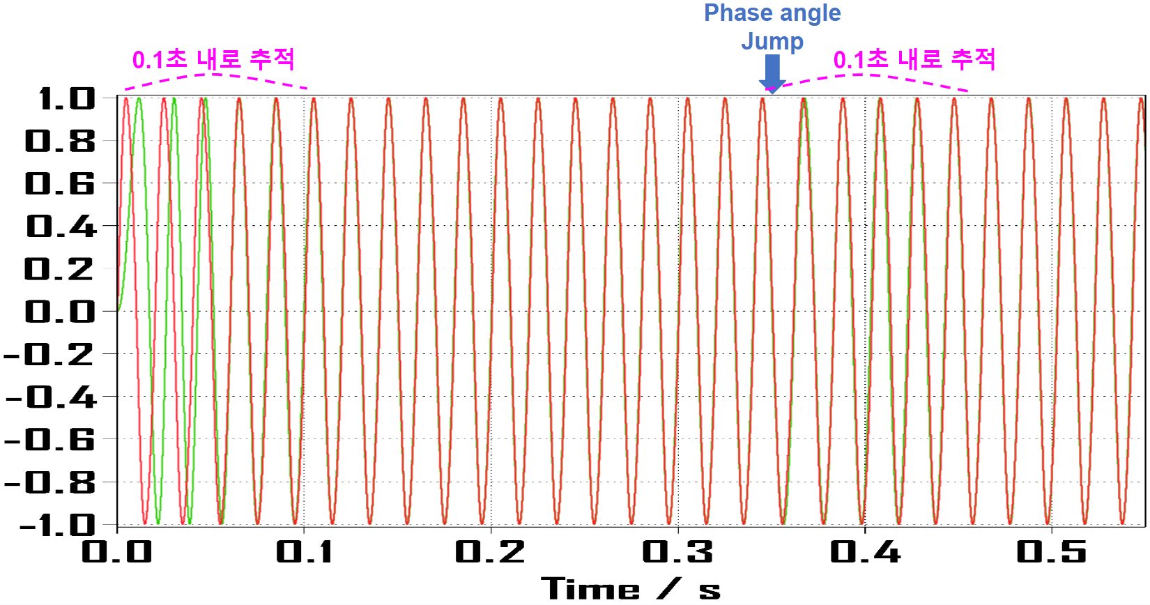 주파수 변화 이후 서로 어긋났다가 0.45초 부근부터 다시 근접하는 것을 볼 수 있습니다.