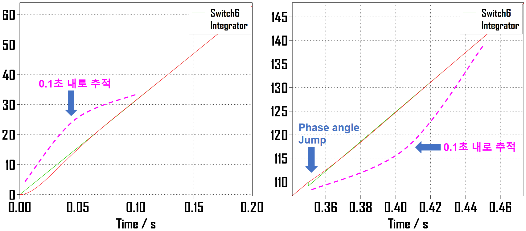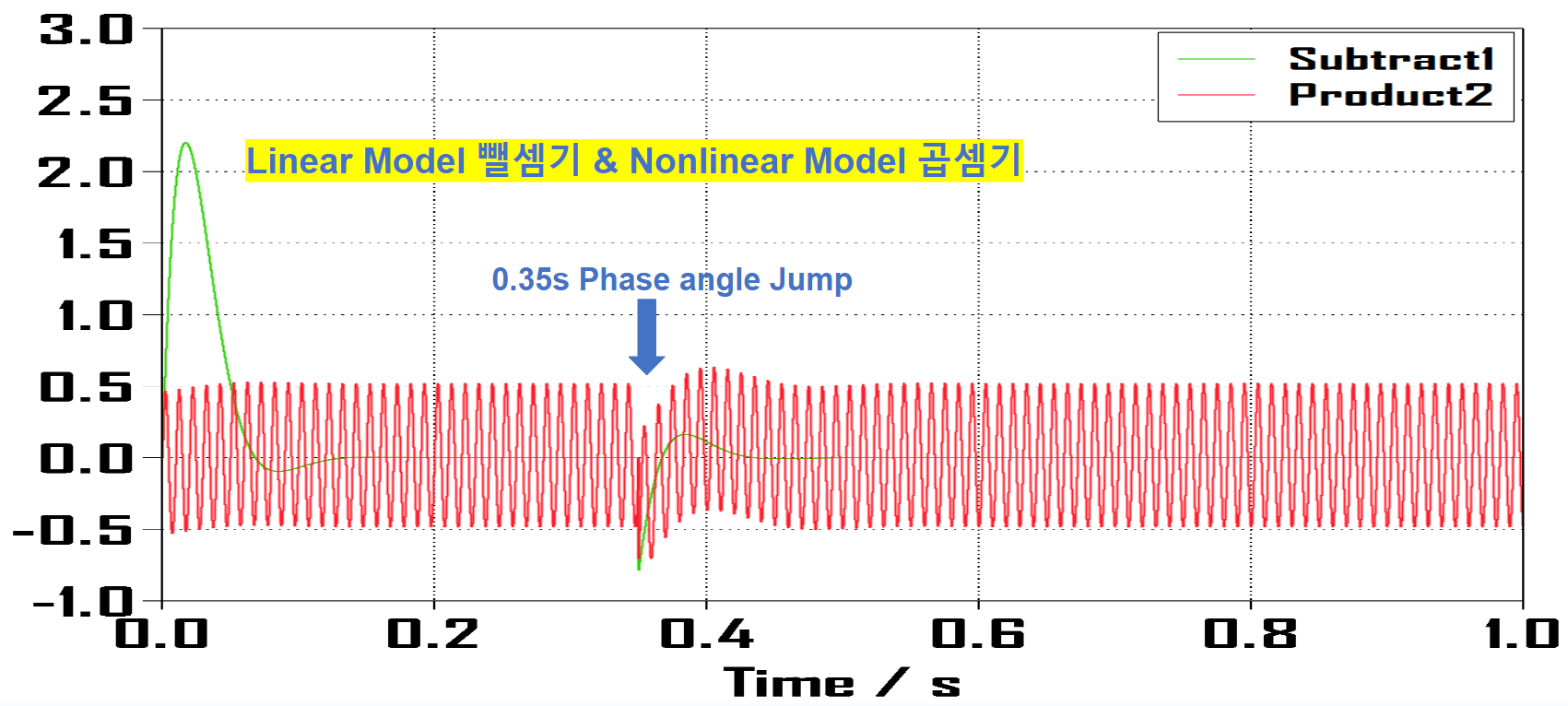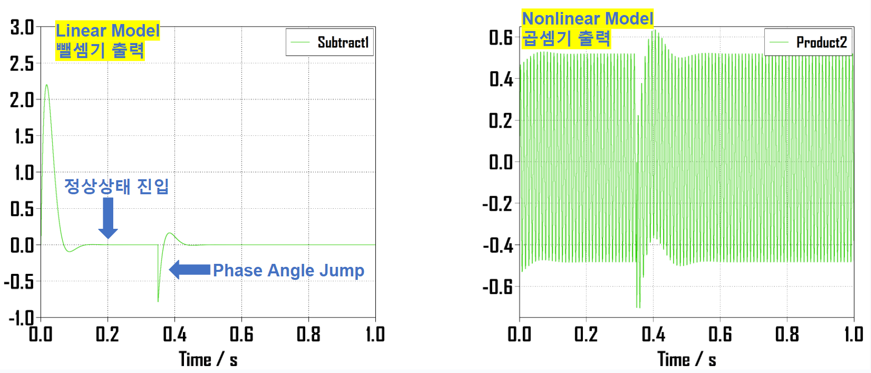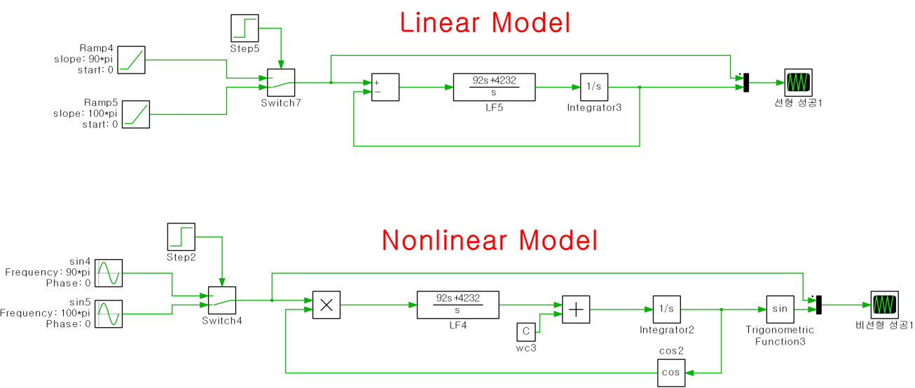 위 사진은 선형 모델과 비선형 모델의 위상각 점프를 Plecs 상에서 구현한 예시입니다.