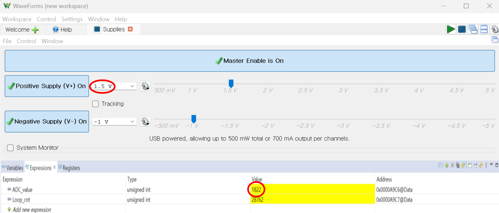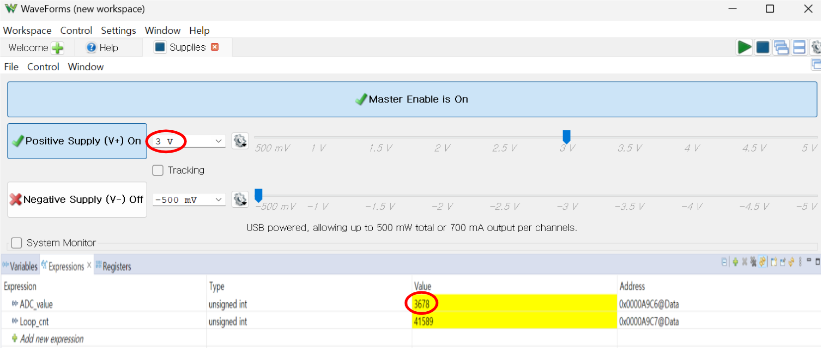 DC값을 0~3V까지 바꿔주면서 ADC_value값이 변화하는 것을 관찰할 수 있습니다.