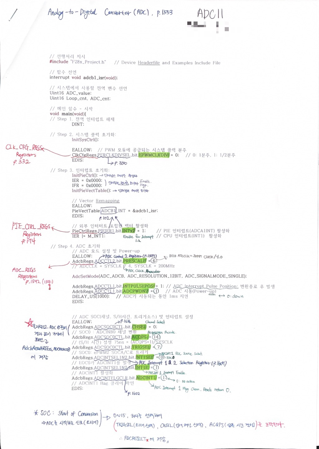 // ADC SOC(채널, S/H시간, 트리거소스) 및 인터럽트 설정