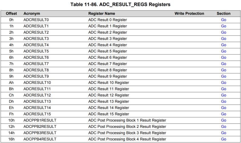 AdcResultREGs.ADCRESULTx에 저장된다.