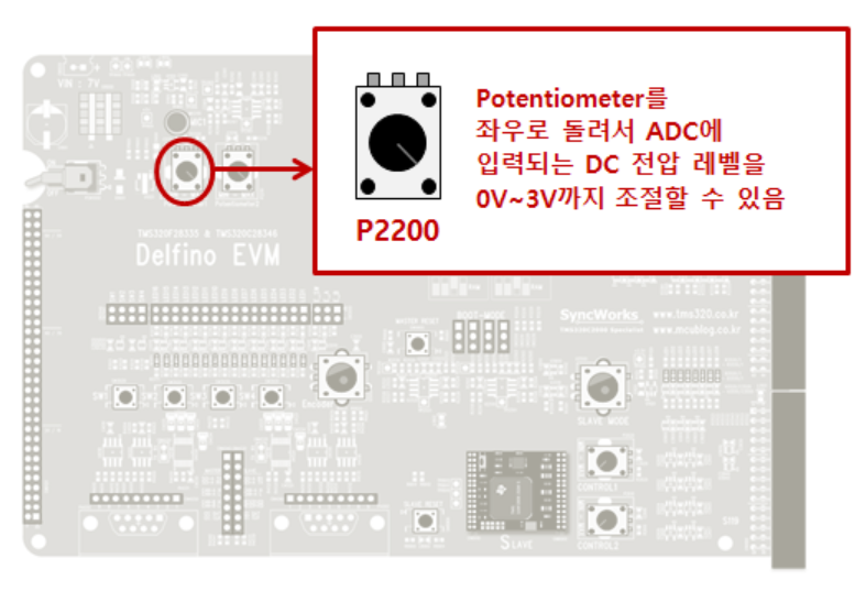 : Delfino EVM의 Potentiometer의 DC 출력 신호를 ADC하고, 결과를 CCS의 Expressions 창에서 확인하는 예제입니다. ePWM 모듈의 타이머를 사용해서 정확한 주기로 ADC-B 모듈의 SOC0 을 트리거 하여 ADC를 진행하고, ADC 변환 종료 후에 인터럽트를 발생시켜서 ADC 결과를 저장하는 예제입니다.
