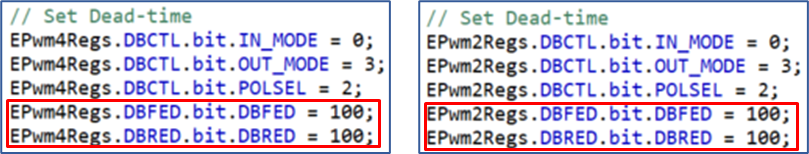 2837xD MCU에서는 (DBRED | DBRED) * (TBCLK Period) 값이 Dead-Band Value로 입력됩니다.